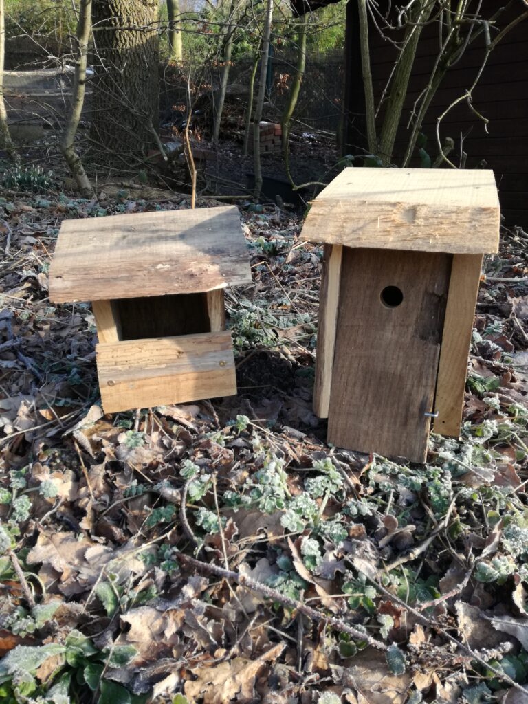 Links im Bild eine Halbhöhle, z.B. für Bachstelze, Hausrotschwanz, Rotkehlchen und Zaunkönig (10 €). Rechts ein Meisenkasten (15 €).