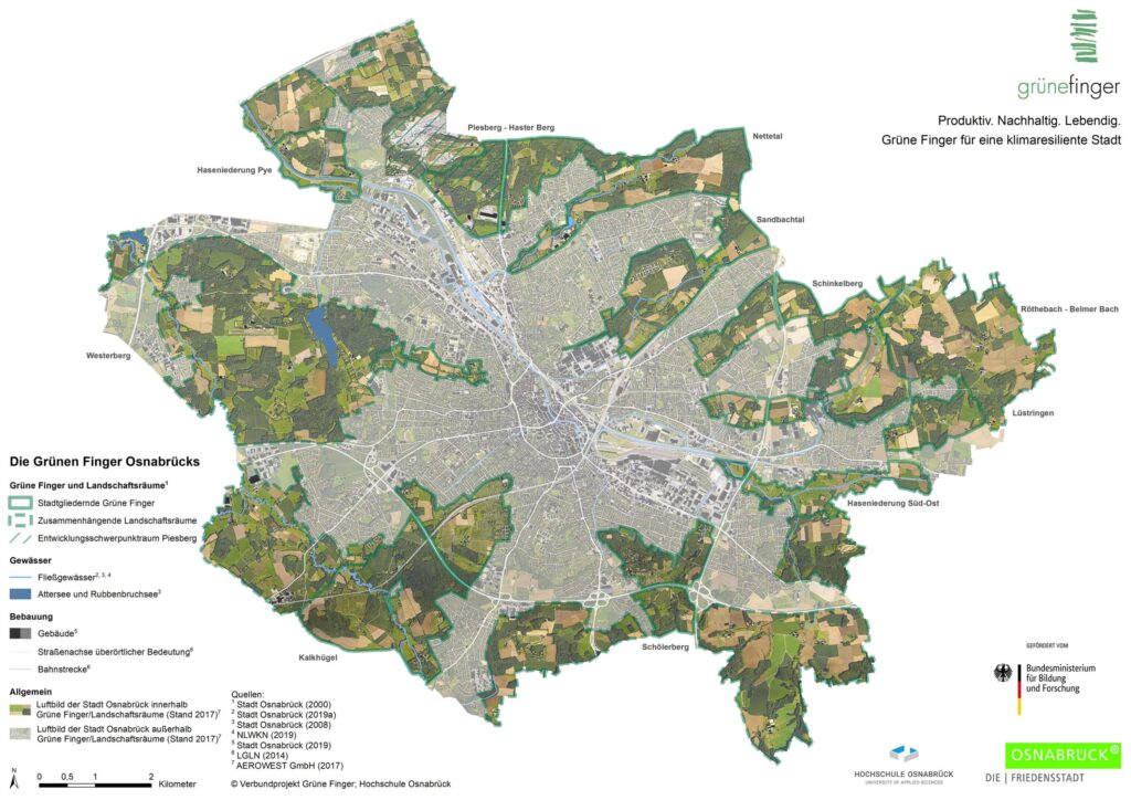 In der Karte kann man die noch nennenswerten Reste der grünen Finger erkennen. Ein Großteil der Stadtgrenze wird von diesen grünen Fingern gebildet. Sie verbinden die Stadt mit dem Umland, in ihnen wird Frischluft in die Stadt transportiert, sie dienen Tieren und Pflanzen als Lebensraum, Tieren als Wanderungsraum und den Bürgern als Raum zur Erholung und zum Naturerleben. In ihnen sind naturnahe, autofreie Rad- und Fußverbindungen ins Umland möglich. Die grünen Finger sind eine Besonderheit von Osnabrück. Lehmann und die Verantwortlichen seiner Zeit haben in größeren Zusammenhängen gedacht und uns heutigen Bürgern einen Schatz hinterlassen.